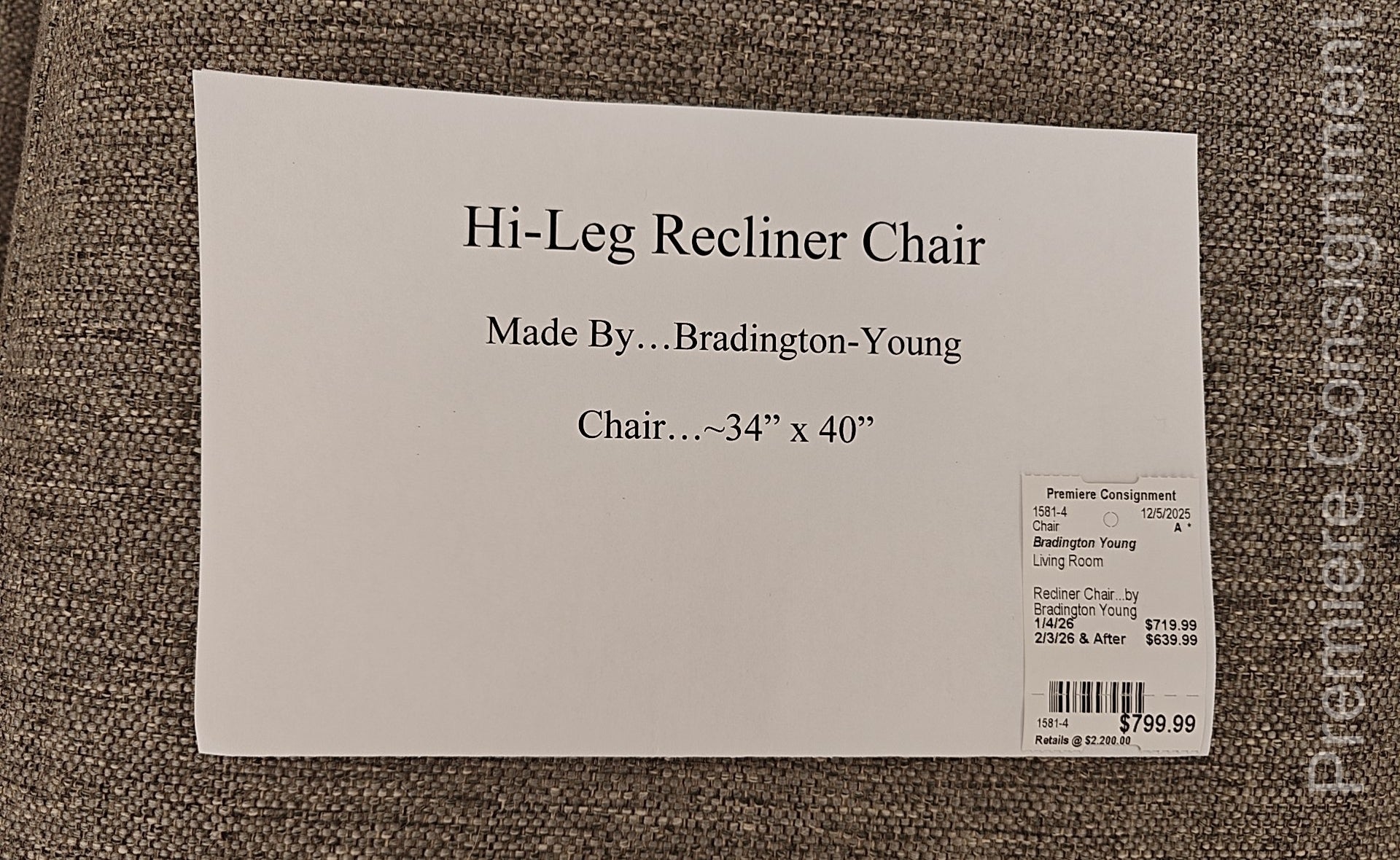 Hi-Leg Recliner Chair...by Bradington Young... 34" x 40"